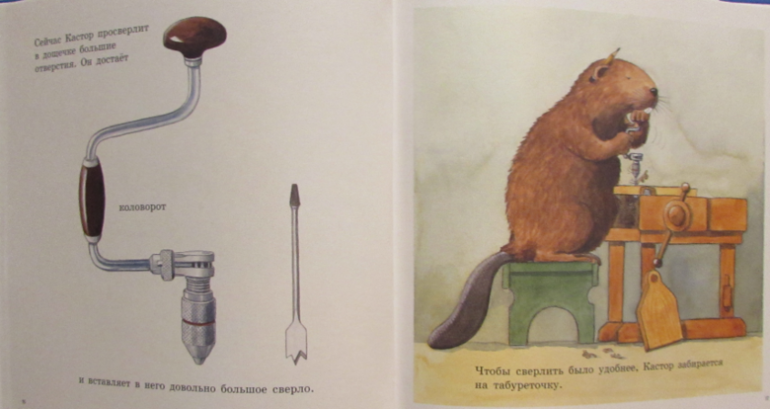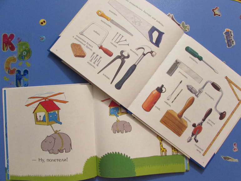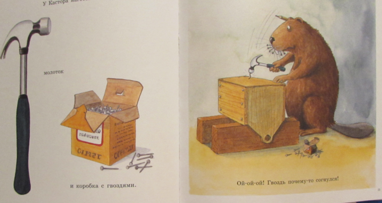 Иллюстрации в книге отличные. Все нарисованные инструменты настолько правдоподобны... они такие как в жизни. Сын, разглядывая картинки, узнавал и проговаривал, что вот это - молоток, а это - отвертка.