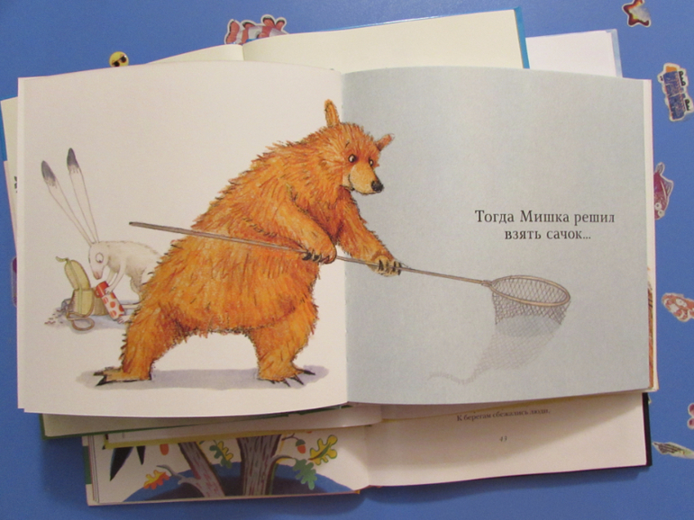 Тогда мишка решил рыбачить сачком, но поймал лягушку.
