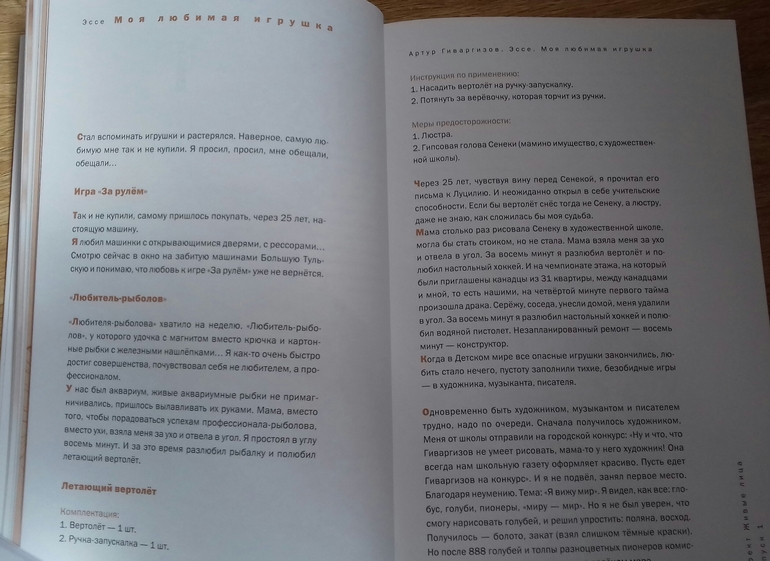 Почему же эти лица живые? Потому что писатели рассказывают о себе сами. Здесь вы не найдете традиционных статей о биографии и творческом пути. Каждый писатель рассказывает о себе так, как хочет, отвечает на некоторые вопросы мини-интервью(причем вопросы довольно необычные, например, кто такие дети? о чем вы думаете, когда смотрите в звездное небо?как вы определяете зрелость арбуза? и т.п.)и представляет эссе на совершенно любую тему. У кого-то получается серьезно, а у кого-то - шутливо. Но, в любом случае, мы видим именно живых людей, а не чей-то рассказ о них .