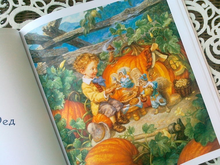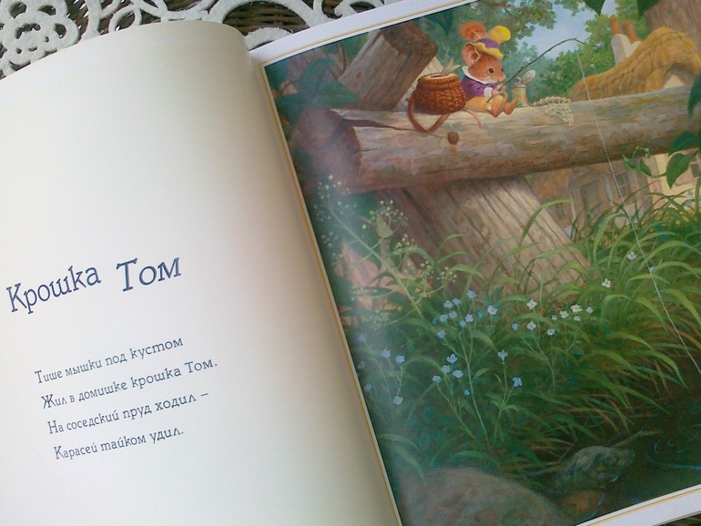 Это Я её ждала. Потому что Сонь переросла, а я вовремя не купила. Решила пусть будет такая невероятная красота и вкуснота у сониных деток)). Но как же я ошибалась. Соня влюбилась в книгу с первого взгляда, таскала её под мышкой везде, выучила все песенки и цитировала их везде и всюду)). А иллюстрации её просто покорили. Она надолго зависала над ними... Вот так бывает)).