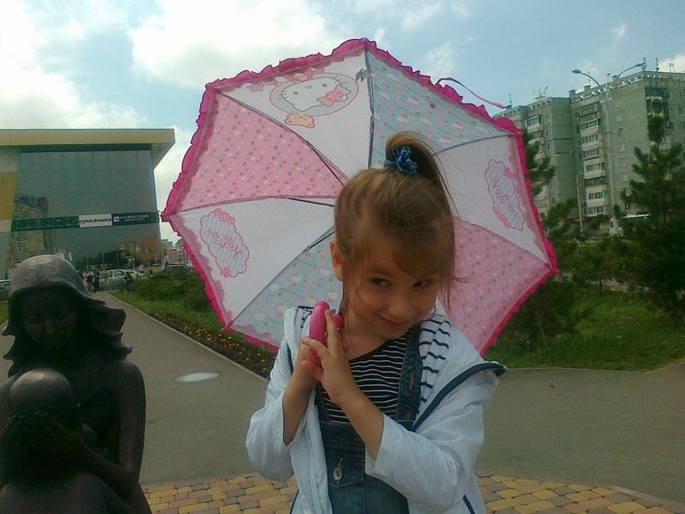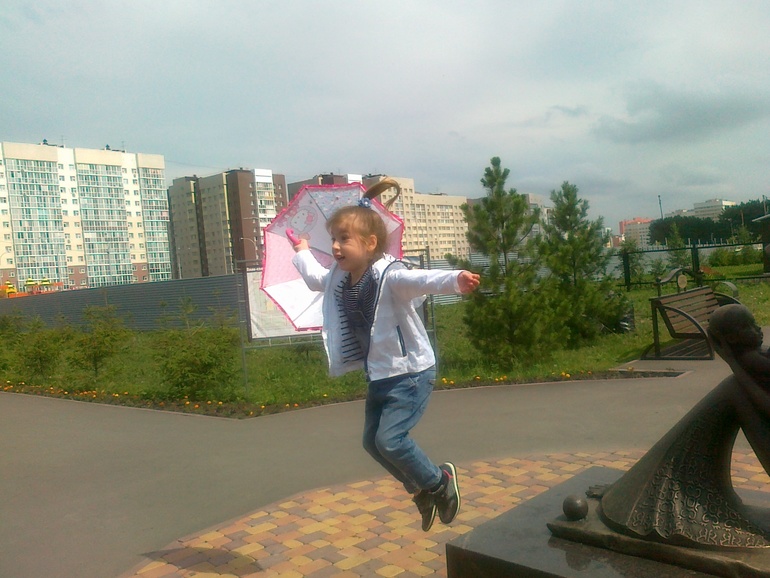 Вчера за вечер мы прочли почти всю книгу. А сегодня с утра, едва открыв глаза, Сонь вытащила из шкафа свой зонт и пыталась улететь. Получилось пока только с кровати на пол). На прогулку зонт, конечно, взяла, поскольку сегодня ветер переменился (погода слегка подпортилась).