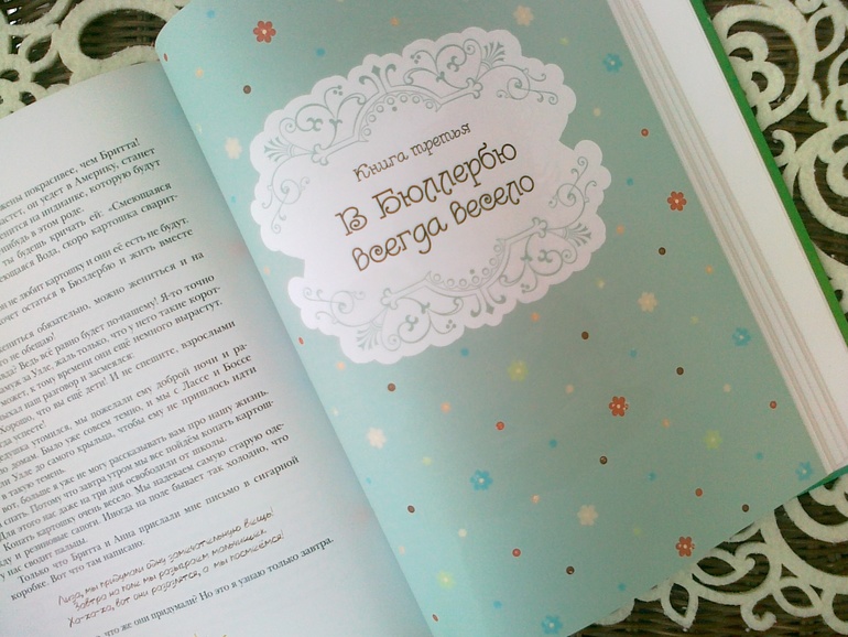 А как-то пару дней назад, уложив Соню спать, я подошла к окну, чтобы немного прикрыть его... На подоконнике лежала раскрытая книга. Это была "Мы все из Бюллербю" Астрид Линдгрен. Открыта она была на третьей книге, которую мы до сих пор не читали. Соня делала загадочные глаза, но, ничего не объясняя, читать не давала. Так вот страница, которая была открыта, оказалась немного надорванной, а рядом лежало написанное сониной рукой письмо её подруге единорогу Нильме (фее по совместительству). В нём она просит помочь починить ей порванную страницу, обещая, когда всё будет исправлено, рассказать нам... Теперь третью книгу мы читаем к огромной радости Сони и к нашему удовольствию. Астрид Линдгрен всегда будет читаться мной именно с удовольствием.