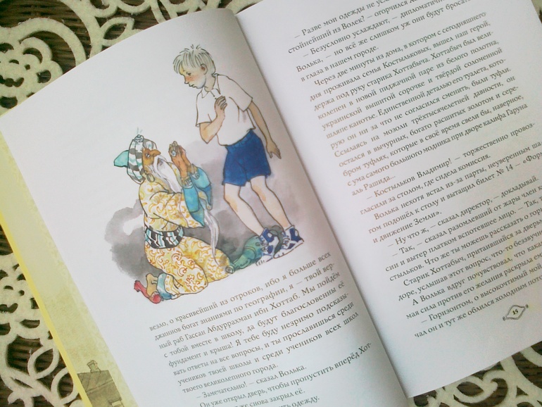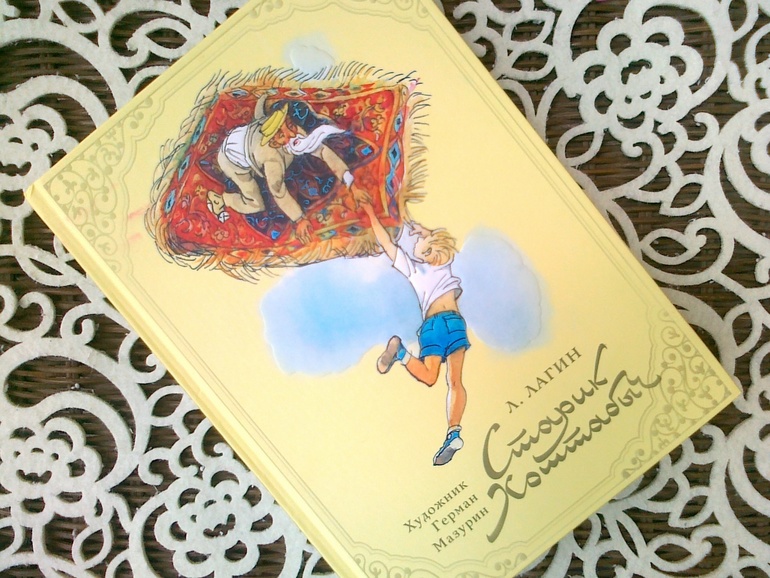 Немного раньше времени, на мой взгляд, Соне пришлось познакомиться с произведением Лазаря Лагина "Старик Хоттабыч". Всему виной стали сонины страхи, возникшие где-то пару месяцев назад. Жутко стала бояться джиннов. Вот в качестве сказкотерапии и была куплена эта книжка. Сейчас мы её уже дочитываем. Соне ой как нравится). Благодаря книге я удостоилась уважительного обращения: "Наталья ибн Юра")). Спасибо "балдой" не называет))). И вообще все эти витиеватые обращения типа "о прекраснейший из отроков" или "звезда сердца моего" её очень веселят. Как и те фокусы, которые вытворяет смешной старикашка из бутылки. Многие вещи ей, конечно, незнакомы, в том числе и связанные с советской эпохой, объясняем по ходу чтения. А книга эта где-то всё-таки помогла Соне, которая решила, что со страхами можно подружиться).