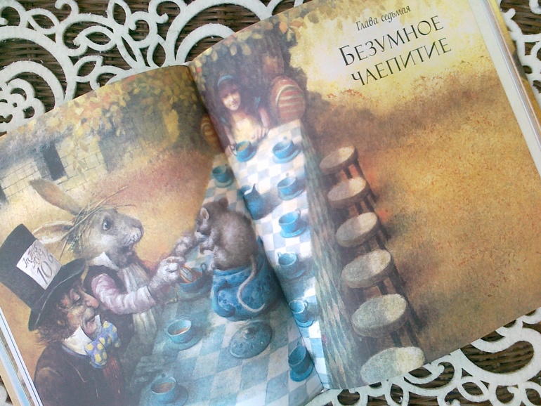 Она до сих пор лежит на её столике. Для меня это удивительно, но Алису она может слушать часами. Она совсем затихает, очень редко что-то спрашивает, иногда мне кажется, что она засыпает... Но нет, всё слышит и мотает на какой-то свой ус, чтобы выдать потом... Её любимая глава - "Безумное чаепитие". А после того, как Академия устроила детям и их родителям вокальный праздник в антикафе в стиле "Безумного чаепития", её от этой истории просто не оттащить)).