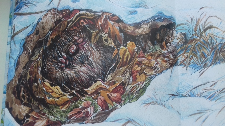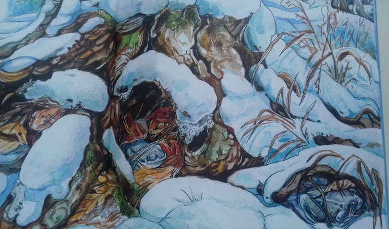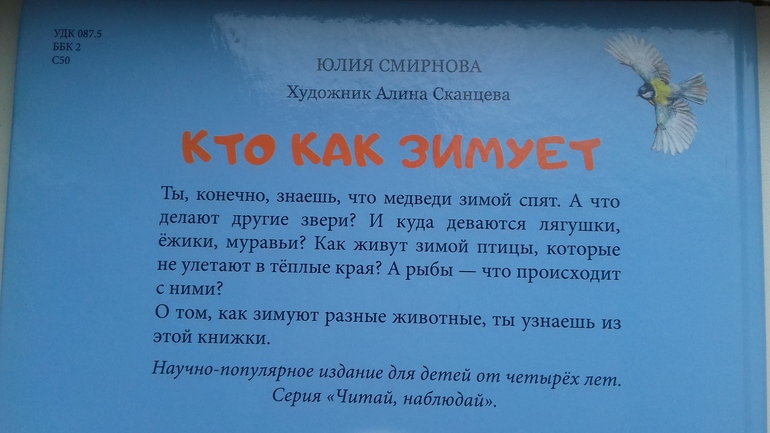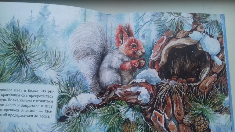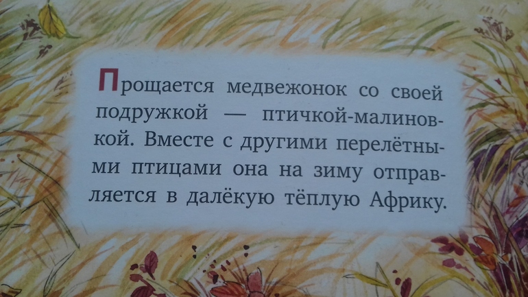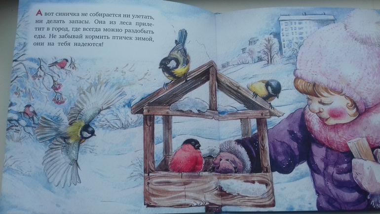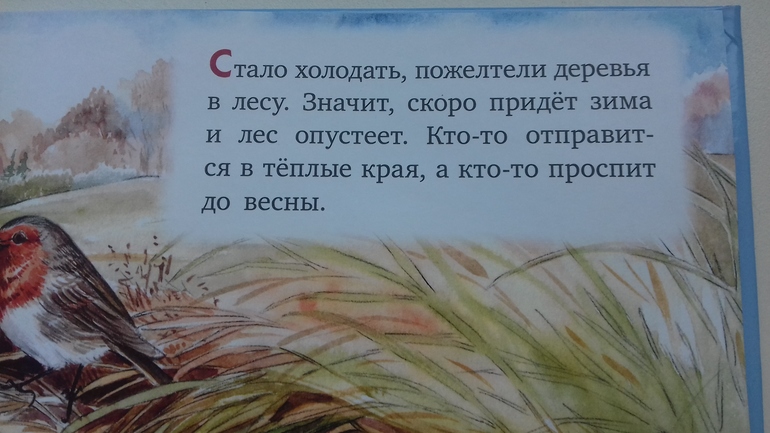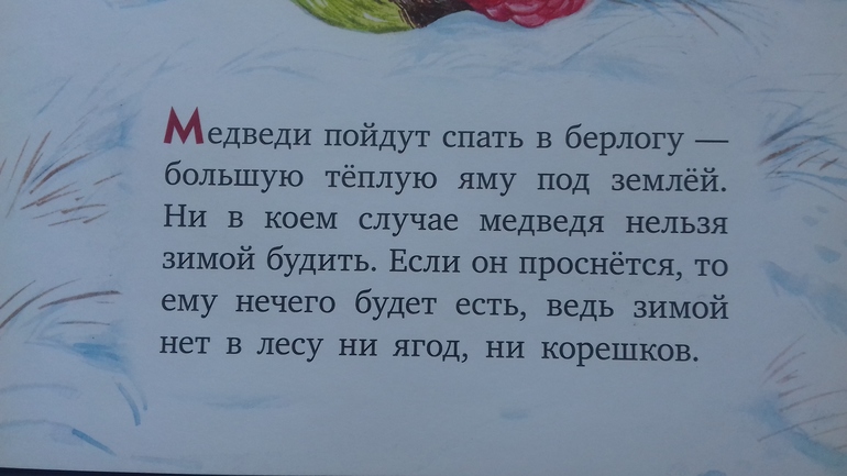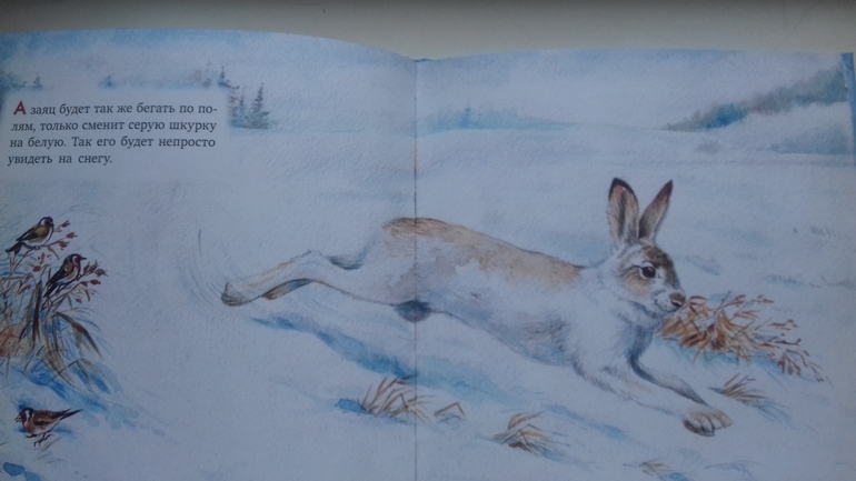 И действительно, здесь в небольшом по объему тексте ребенка знакомят с тем, что происходит зимой с перелетными и зимующими птицами, с рыбами, насекомыми, земноводными и зверями(теми, кто ложится в спячку и теми, кто и зимой ведет активный образ жизни).
