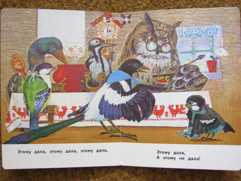Сорока-белобока у нас есть, я привезла из Питера - купила, хоть дети ее давно "переросли" на взгляд очень и очень многих )) Я к мнениям о "переросте" отношусь наплевательски - лишь бы нравилась! Вот и взяла, не устояла. Очень ее люблю - такая красивая! Птицы нарисованы бесподобно!