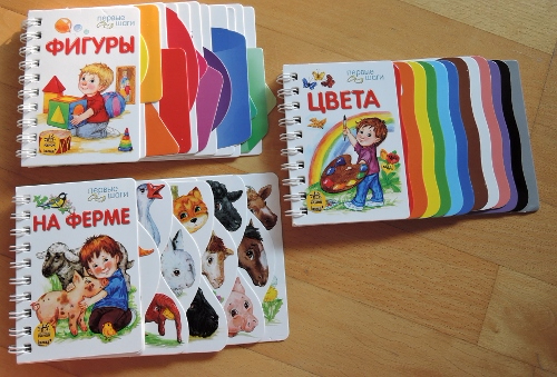 Хорошая серия книжек про цвета, формы, животных на ферме, еще есть про буквы и цифры. Удобный формат, на пружинке. Приятные для слуха стихи внутри.
