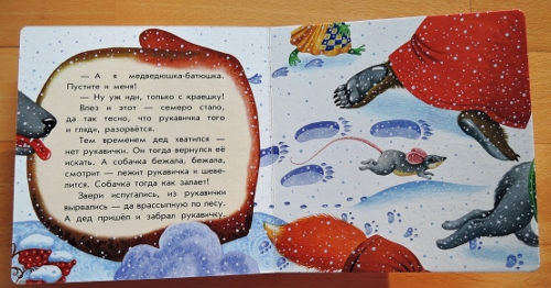Маленькие картонки с короткими вариантами всем известных сказок. Очень нравятся спокойные цвета. Покажу внутренности на примере одной из них:
