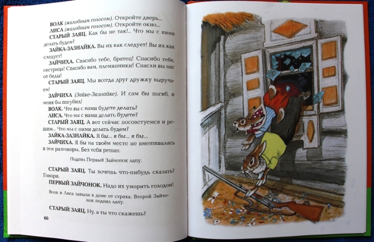 Сама история очаровательна. Зайчишка раздобыл ружье и выгнал лису из ее избушки. И все бы нормально было, но зазнался он сильно. Родных своих зайцев обидел, лисе в услужение пойти предложил, волка на цепь… Ну сильно зазнался. Очень ярко и понятно для детей это описано. Но самое главное, что зайцы не отвернулись в обиде от зайки-зазнайки и все равно выручили его с трудную минуту. Михалков сумел выразить и плохие, и хорошие человеческие качества понятно для детей.