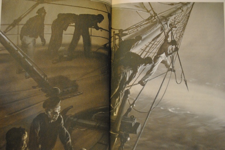 А вот команда корабля приготовилась к поимке морского чудища. Все напряжены и с тревогой всматриваются в морскую пучину