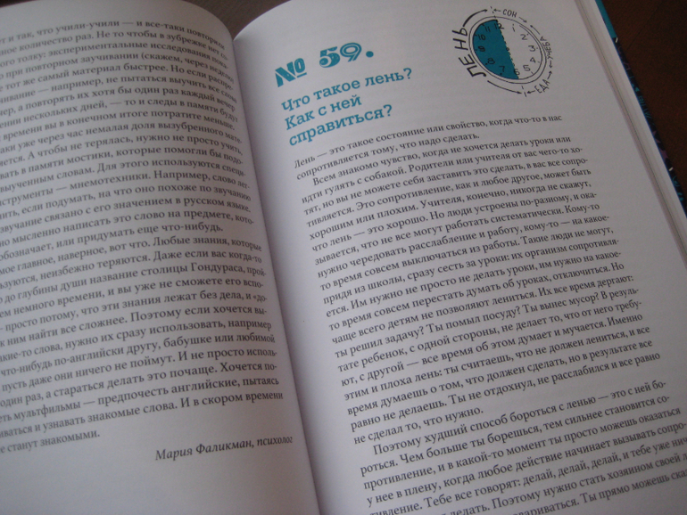 Причем, не абстрактные какие-то вопросы, придуманные взрослыми, а вполне реальные, живые, которые действительно задают дети, например: "Почему я учу английские слова, но все время их забываю?" Или вот, очень актуальный вопрос: "Что такое лень и как с ней справиться?" Или: "Зачем ходить в школу?" Мне кажется, многим взрослым тетям и дядям не мешало бы узнать ответы на многие вопросы в этой книжке :-)