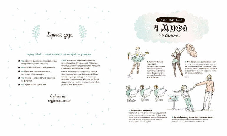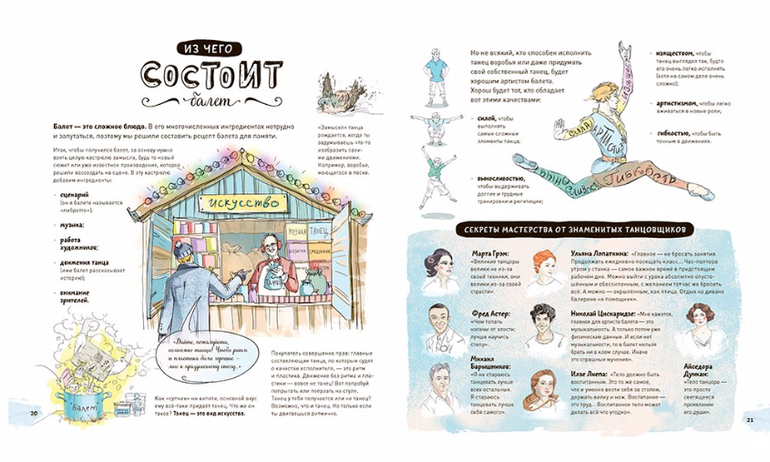 Вы и ваш ребенок сможете сами попробовать сделать несколько па по схемам. Вы узнаете секреты мастерства нескольких знаменитых танцоров: Ульяны Лопаткиной, Михаила Барышникова, Николая Цискаридзе и других.
