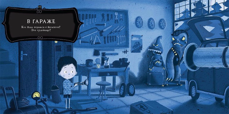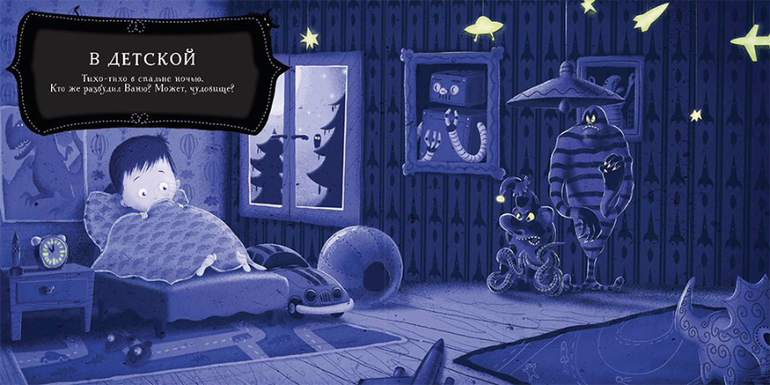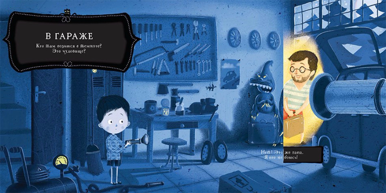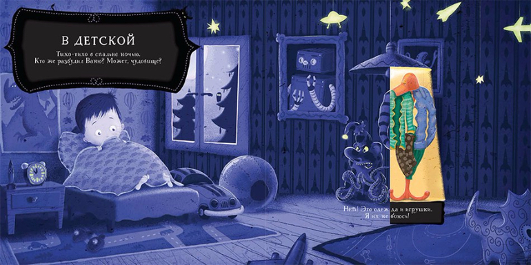 Подвижные элементы позволяют в прямом смысле "включить свет" прямо на странице книги! И тогда страшные чудовища превращаются в груду одежды, в кошку или собаку, а может быть даже в папу.