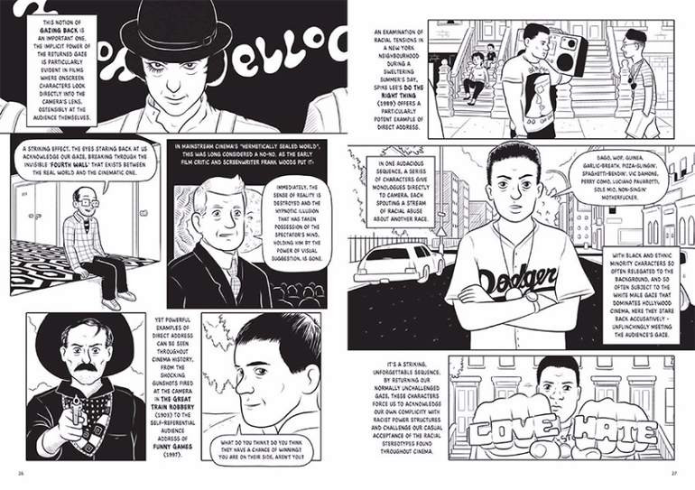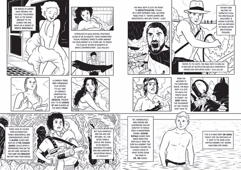 Используя язык комикса, автор рассказывает об истории и современных теориях кинематографа с трогательной интонацией заядлого кинофаната, не разрушая магию кино, но дополняя ее новыми оттенками. Разделив книгу на 7 тематических глав (Глаз, Тело, Декорации и архитектура, Время, Язык и голос, Идеология и власть, Технологии и технофобия), Росс смешивает в своем исследовании классику мирового кинематографа (Хичкок, Чаплин, "Гражданин Кейн"), массовое кино ("Терминатор", "Чужой") и арт-хаус ("Быть Джоном Малковичем", "Вальс с Баширом").