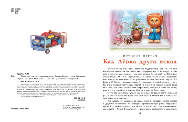 Знакомьтесь - это Лёвка. Он - лев. Игрушечный, но очень храбрый! Только с ним приключилась самая настоящая, не игрушечная беда - хозяйка не захотела с ним играть. А какая же ты игрушка, если с тобой никто не играет? И Лёвка решился на отчаянный шаг - сбежать из дома и найти верного друга. Ведь должен же где-то быть тот, кто мечтает об игрушечном львёнке в синем комбинезоне! В поисках своего места в жизни Лёвка прошёл путь, полный чудес, удивительных встреч и, конечно, опасностей и испытаний. В книге - три истории о необыкновенных приключениях отважного Лёвки и его новых друзей. А познакомил читателей с Лёвкой Андрей Бузуев - поэт, писатель и музыкант.