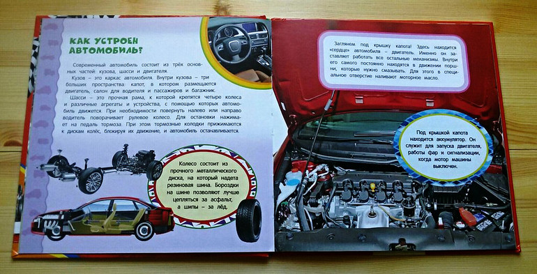 Брала эту книгу сыну на вырост, но что-то из нее мы читаем уже сейчас. Информации немного, она простая, но интересная. Думаю, оптимальный возраст для этой энциклопедии три-четыре года. Она хорошо подойдет для первого знакомства с устройством автомобиля и с большим разнообразием различных видов транспорта.