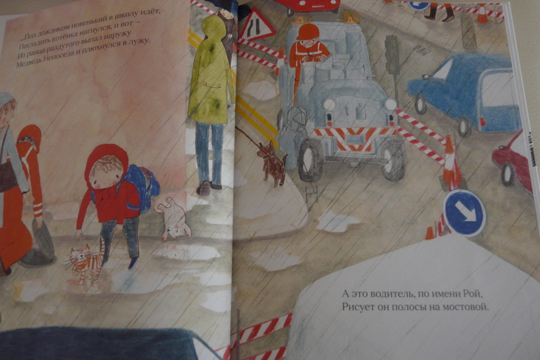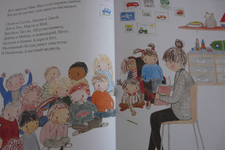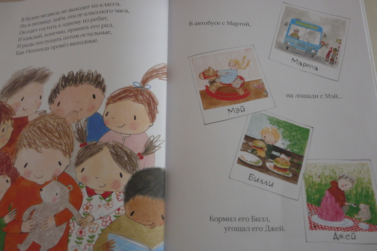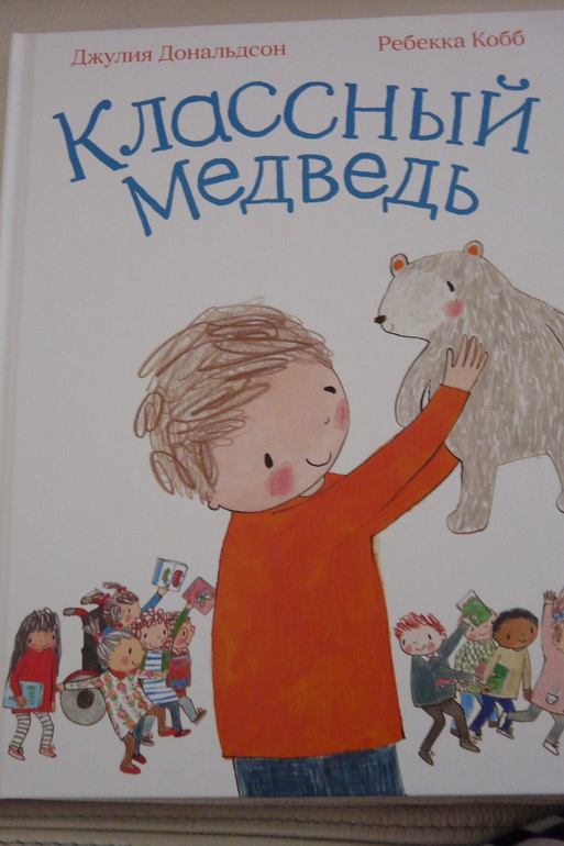 Почему эта книга?Моему ребенку очень понятен сюжет,т.к живем в Испании и тут в детских садах есть такая же традиция,что в классе есть "домашнее "животное ,у нас в первом классе был бегемот,во втором жираф.Дети в первом триместре выполняют разные задания на тему этого животного,и по пятницам ,кто-то берет его домой на выходные.Книга именно про это, в один день медвежонок выпал у мальчика из рюкзака и пережил много приключений. В отличии от других книг автора,тут нет "юмора",книга спокойная ,без претензии на уникальность.Иллюстрации выполнены новым для нас художником Ребеккой Кобб, ее же рисунки можно увидеть в книге "Бумажные куклы"