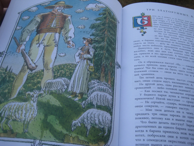 Почему я говорю: "Одолел", а потому что сказок там ну очень много! И некоторые из них очень, очень длинные. А еще и шрифт мелкий. Я даже сначала не хотела ему давать читать самостоятельно - за зрение опасалась, мы же и так в очках читаем... Но охота пуще неволи, даже прерваться не захотел, переключиться на что-то другое.