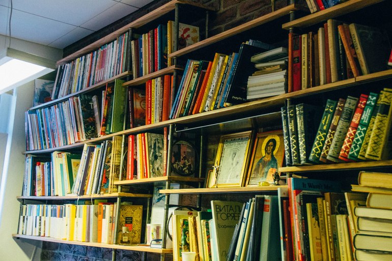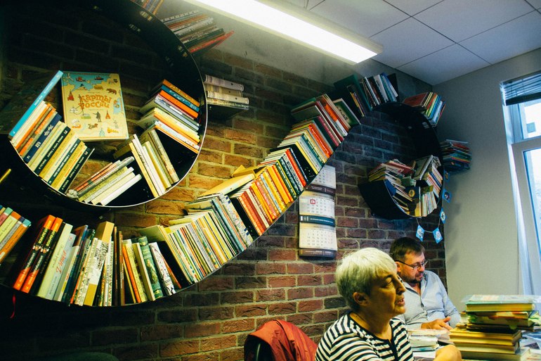 Туда, где можем окунуться в книжный мир. Где люди сидят за компьютерами, но книги окружают их со всех сторон.