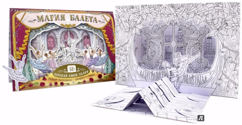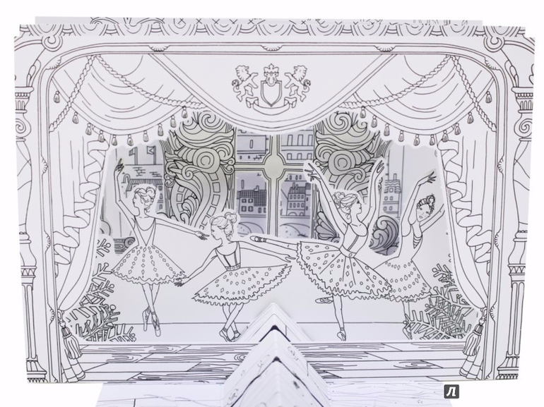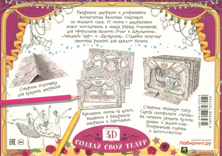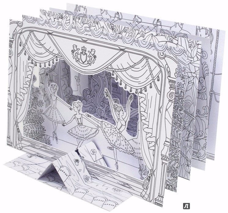 Раскрасьте декорации и устраивайте великолепные балетные спектакли на объемной сцене. 22 листа с декорациями можно использовать в самых разных сочетаниях для оформления балетов "Ромео и Джульетта", "Лебединое озеро" и "Щелкунчик". Создайте несколько цветовых решений для каждого балета.