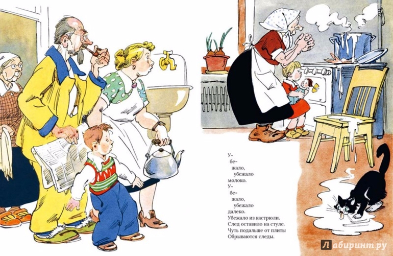 Текст печатается по изданию: Яковлев Ю. Убежало молоко : стихотворение. М.: Детский мир, 1959. Художник Юрий Узбяков