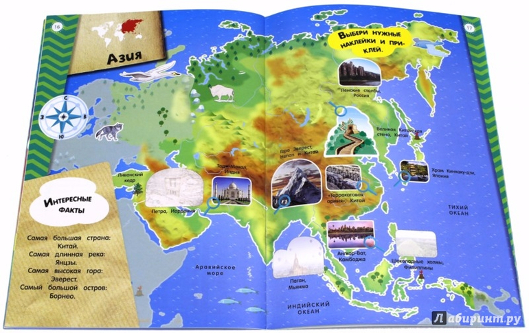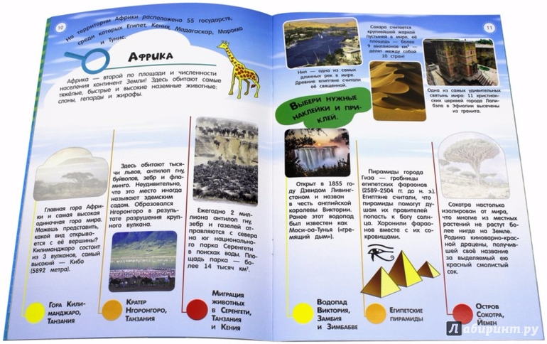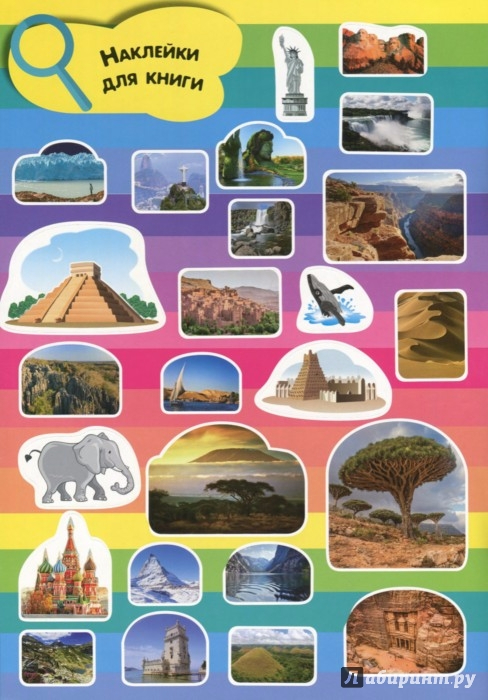 Ты увидишь величественные водопады Венесуэлы и Замбии и легендарный Колизей, разрушенные и действующие вулканы Танзании и Италии и знаменитую Эйфелеву башню, а десятки ярких наклеек сделают твое путешествие еще интереснее!