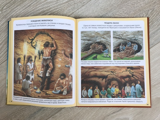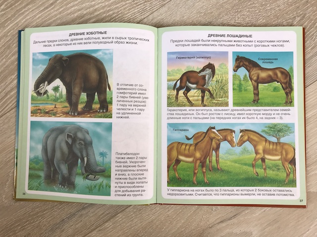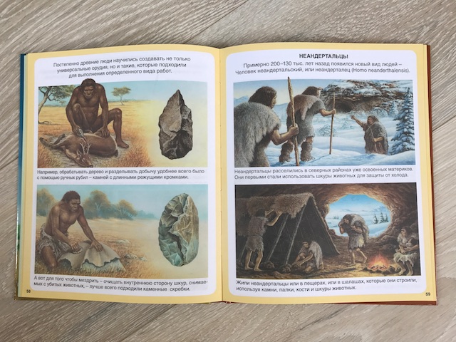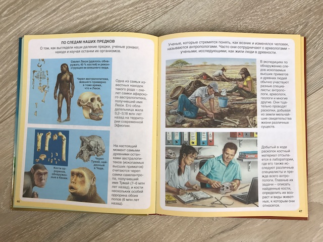 Год назад у Насти был большой интерес к динозавром, так что про этих ящеров у нас есть что почитать. Глядя на обложку, можно было бы подумать, что и эта энциклопедия посвящеа динозаврам, но это не так: здесь компактно рассказывается история происхождения человека и показано большое количество доисторических животных. Насте эта маленькая энциклопедия очень нравится, прочитали уже несколько раз с начала и до конца и теперь время от времени читаем отдельные главы. Текст немного сухой для 4 лет, я иногда рассказываю своими словами, попроще и понятнее. Но и иллюстрации, и подбор материала - то что нужно дошкольникам.