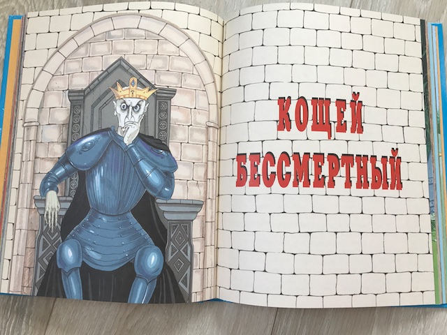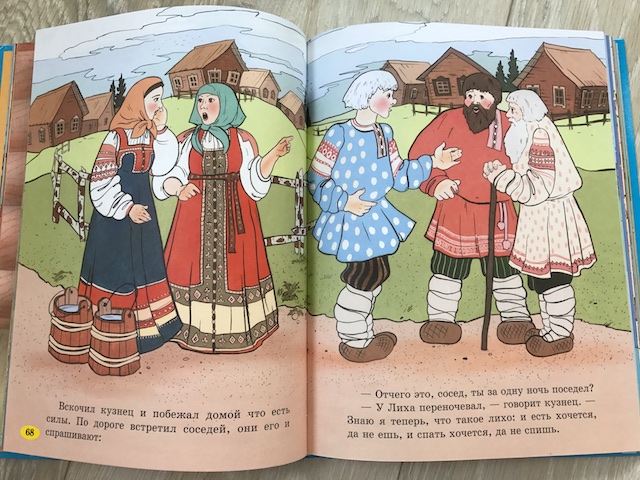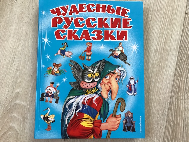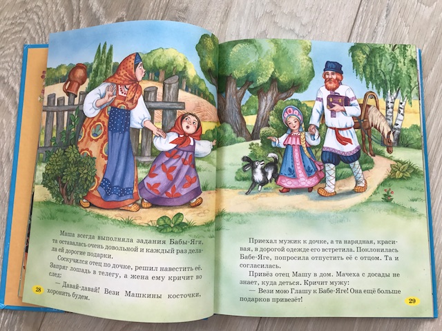 Последний раз по пути из России домой я видела эту книжку в магазине в аэропорте. В дьютифри цена была около 1000 рублей, на месте покупать не стала, а заказала в Лабиринте и родители недавно ее привезли. Иллюстрации разных авторов, есть очень неплохие, есть совсем неудачные. Но мне понравился состав сказок, детский пересказ и то, что в ней встречаются многие известные герои народных сказок. Мне важно, чтобы у Насти сформировалось общее представление о русской культуре, и без бабы Яги, Кощея и Ивана Царевича здесь не обойтись. У нас есть другой сборник русских сказок, но почти без иллюстраций и со всеми недетскими подробностями вроде порубленного на куски Царевича. Так что я этой книжкой довольна. Прочитали из нее пока только парочку сказок и вообще Настя как-то не вдохновилась, сама читать не просит, хотя пролистала и иллюстрации посмотрела с интересом. Но у нее сейчас вообще период боязни "страшных" книг, такое уже было и, думаю, скоро пройдет.