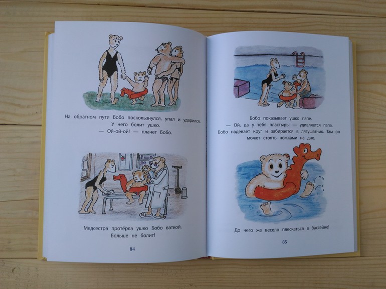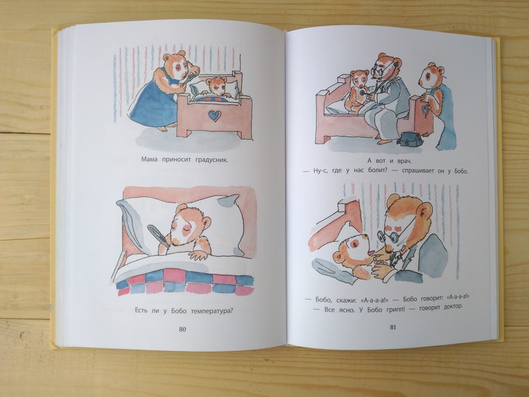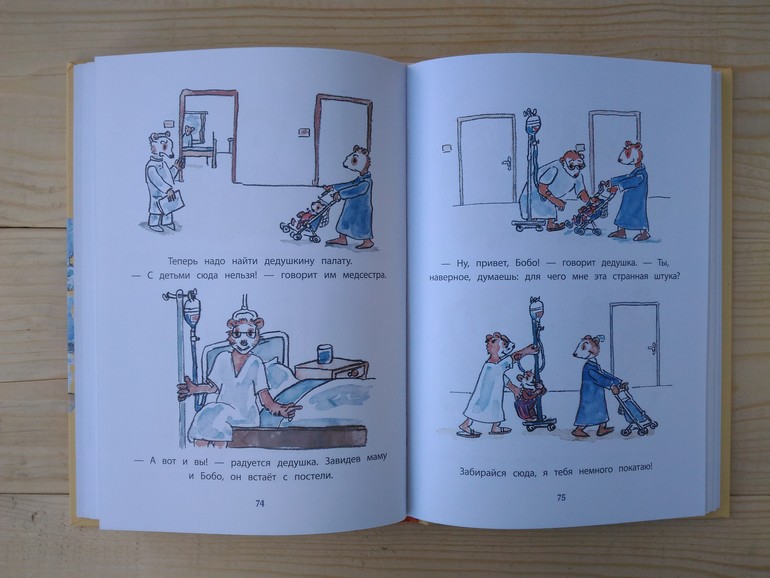 Бобо с мамой навещают дедушку в больнице. Больной в свою очередь предлагает внуку покатать его на капельнице. Капельница при этом называется "странной штукой". Кажется, автор вновь даёт нам простор для дополнительного просветительского разговора с ребенком. Но вот как объяснить, что такое капельница, на которой дед катает внука, я, пожалуй, не смогу ребенку никакого возраста))).