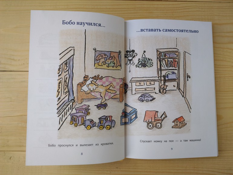 В каждой из них Бобо проживает простые ситуации из жизни годовалого малыша. Он гуляет на детской площадке, болеет, рисует, ходит с мамой в магазин: