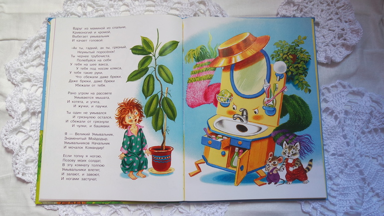 Посмотрите какой грязный мальчик ковыряет в носу. Моя дочка говорит "Ай-ай-ай!!!" А какие утюги и одеяло: все очень реалистично, но с ногами и глазами))Познакомьтесь с современным Мойдодыром . У нас есть эта сказка еще в двух изданиях, но там Мойдодыр с умывальником, а здесь знакомый смеситель.