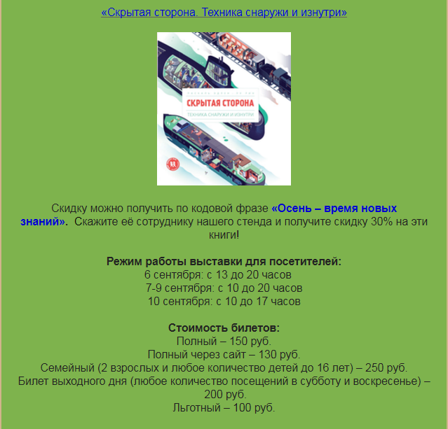 Дополнительно скидки нашим друзьям из соцсетей. Тем, кто внимательно за нами следит. Каждый день выставки будем публиковать кодовые слова, которые будут давать скидку (дополнительно) на следущий день.