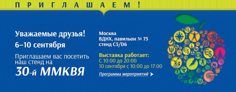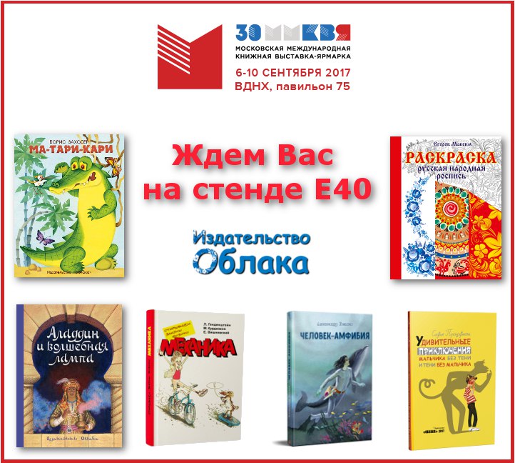 Дорогие друзья, приглашаем на 30-ю, юбилейную Московскую международную книжную выставку-ярмарку, которая пройдет с 6 по 10 сентября 2017 года в павильоне №75 ВДНХ. Режим работы выставки для посетителей: 6 сентября: с 13 до 20 часов, 7-9 сентября: с 10 до 20 часов, 10 сентября: с 10 до 17 часов.