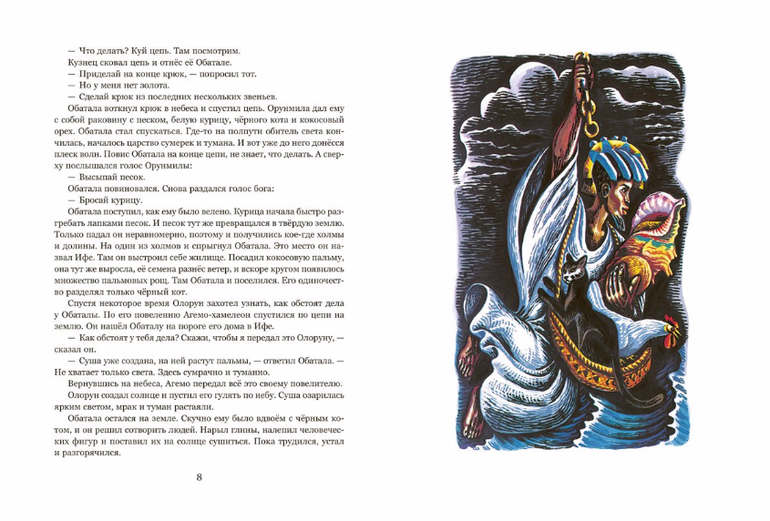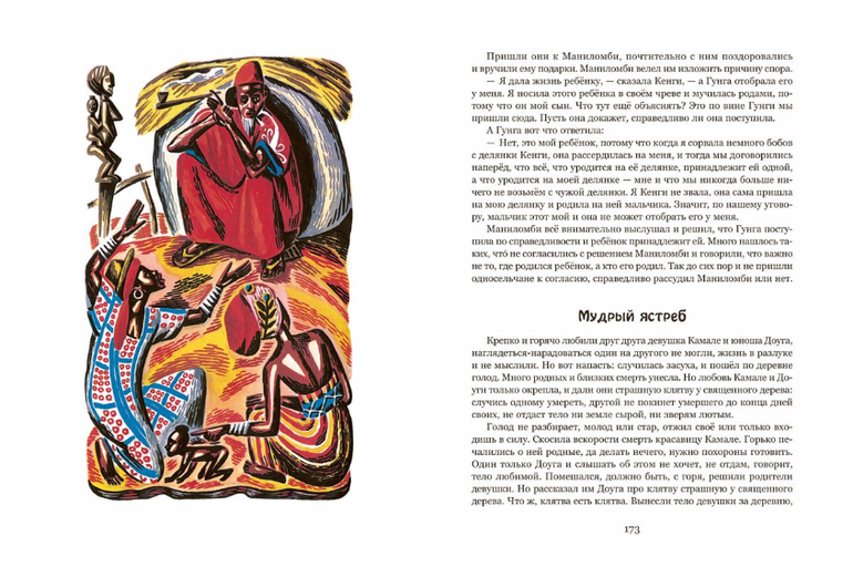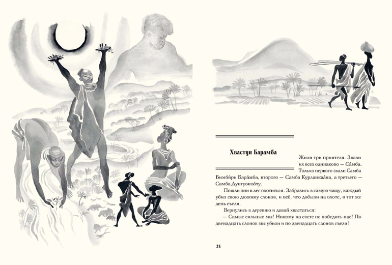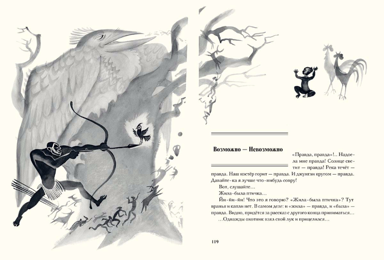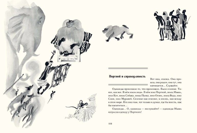 Если для Виктора Важдаева Африка была давней и вечной любовью, то для художника Ники Гольц африканские сказки стали полем для эксперимента. Одна история - всего одна чёрно-белая иллюстрация. Но в ней сплетены все сюжетные линии и представлены все герои. И когда сказка заканчивается, хочется пролистать страницы обратно и ещё раз рассмотреть рисунок. А вдруг художник кого-то всё-таки не нарисовал?