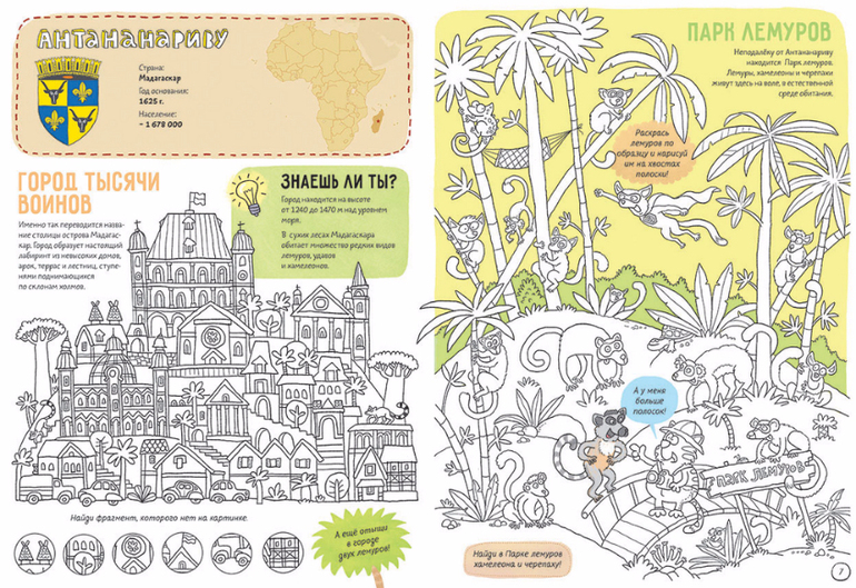 Четырнадцать городов - четырнадцать ярких историй. Раскрась их, найди ответы на загадки и путешествуй по Африке вместе с котом Батоном!