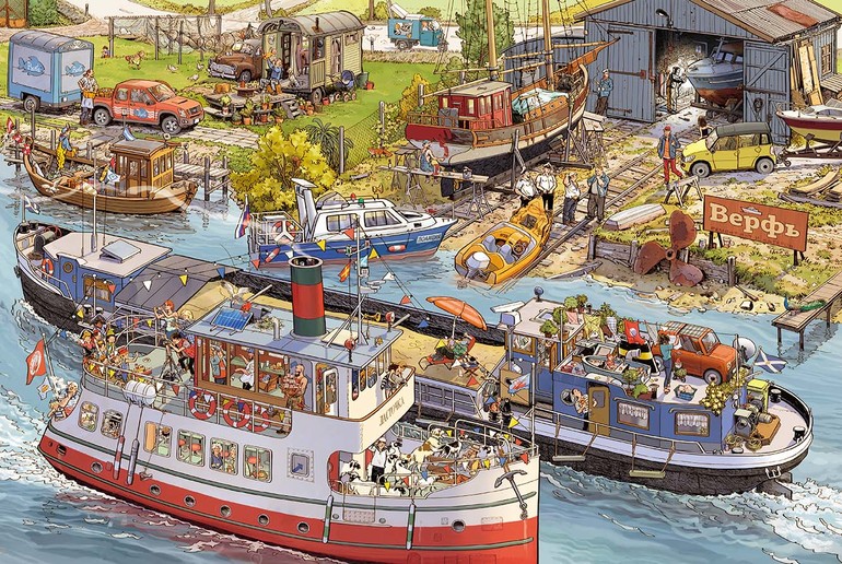Кроме Паши, Маши и их родителей от разворота к развороту (даже начиная с обложки) в этой книге «путешествуют» и другие персонажи. Например, старичок в клетчатом пиджаке и с тростью; мама с двумя близнецами; мужчина в фуражке с собакой; юноша с зелеными волосами и белым пуделем. Попробуйте проследить их истории. А может быть, вы заметите и других «путешествующих» персонажей?