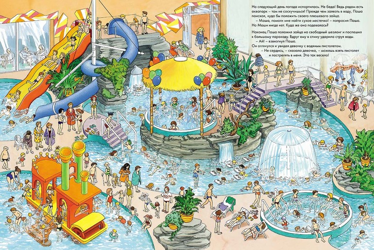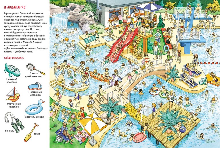 А еще вместе с этой книгой родители и дети могут придумывать свои собственные задания «найди и покажи», как например: отыщи в книге спортсмена-бегуна; найди надувного крокодила в аквапарке и так далее.