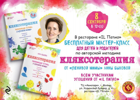 8 сентября в 12.00 издательство «Эксмо» приглашает детей и родителей в ресторан итальянской кухни «ILПатио» в ТРЦ Авиапарк на мастер-класс по методике «Кляксотерапия» Анны Быковой. Вы будете творить, веселиться и учиться!