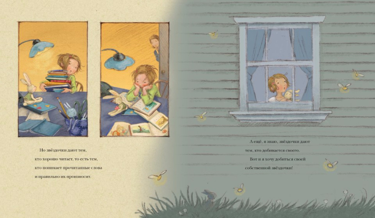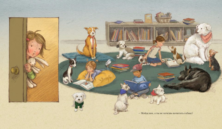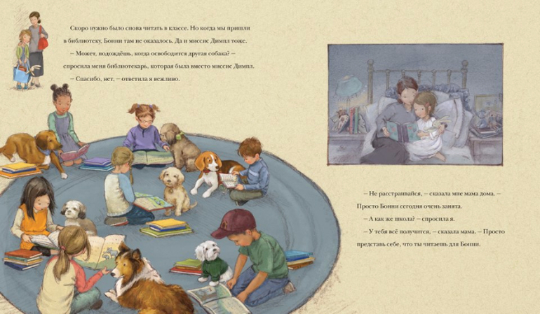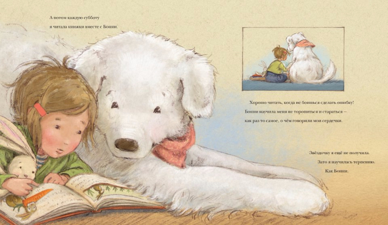 К счастью, девочка подружилась с библиотечной собакой Бонни. И оказалось, что это не так уж и плохо, когда читаешь книжку вслух для Бонни. Потому что Бонни не сердится, если девочка запинается, а кроме того, можно погладить собаку, пока выговариваешь трудное слово. И вообще, хорошо читать, когда не боишься сделать ошибку.