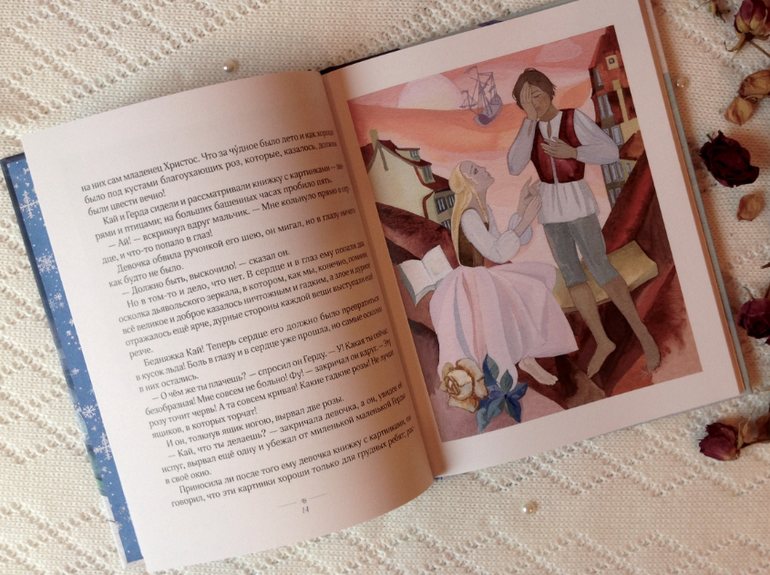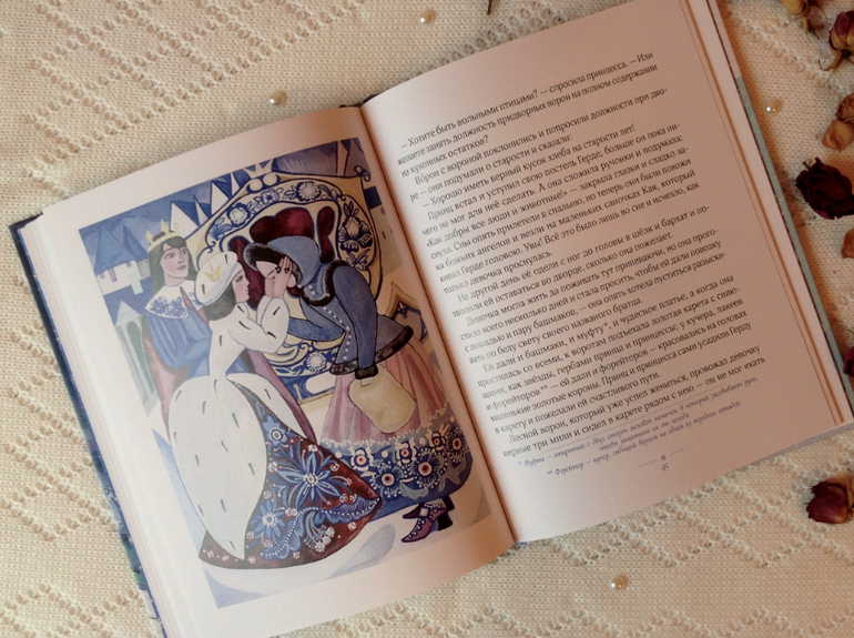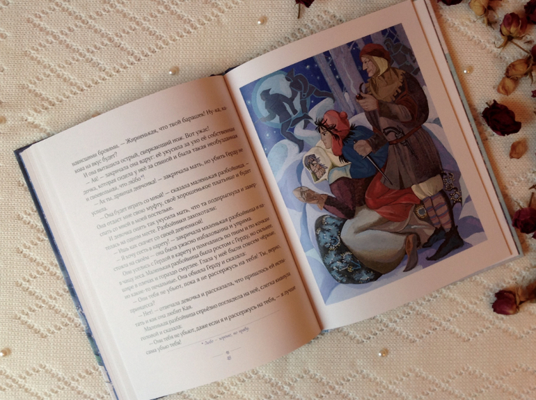 Художница Тамара Юфа великолепно передала северный колорит этой сказки. Какая холодная и статная Снежная королева, а Кай и Герда такие юные и чистые. Вообще лица всех героев кроме самого разбойного разбойника очень красивые. И наряды у Герды, особенно юбки!