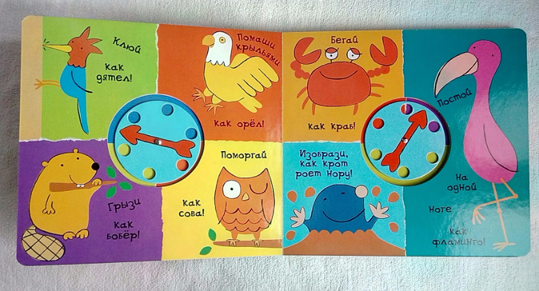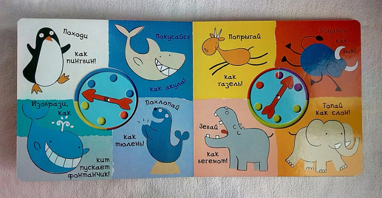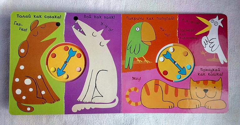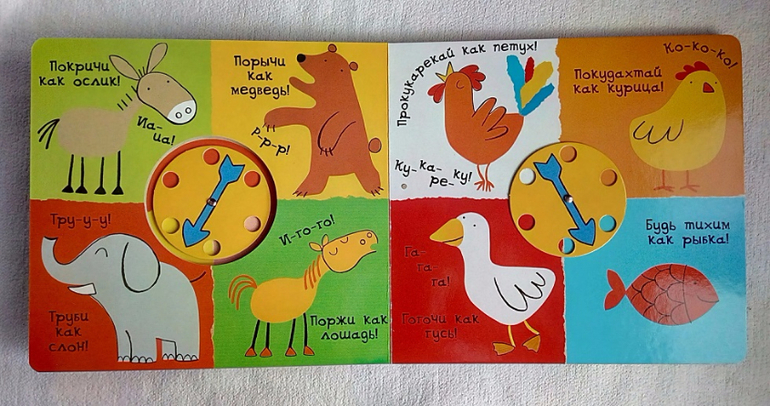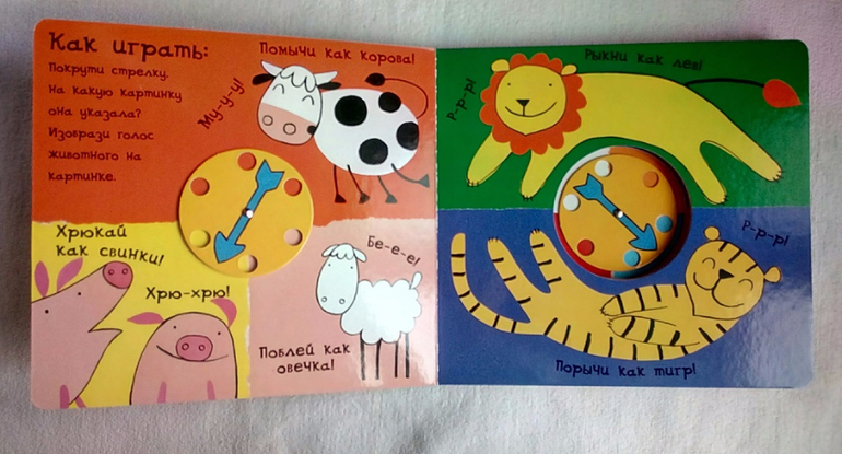 Начнем со звуков. Перед вами вся книга. Крутим стрелочку и мычим, рычим, квакаем, пищим, крякаем, шипим или... вдруг замолкаем.
