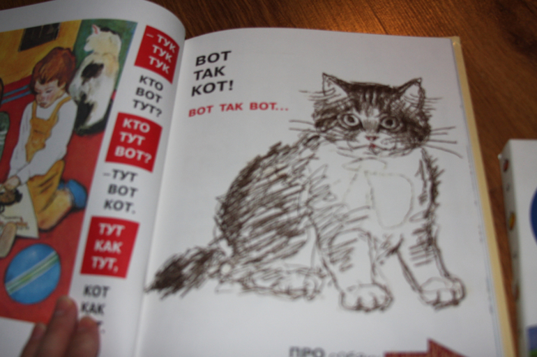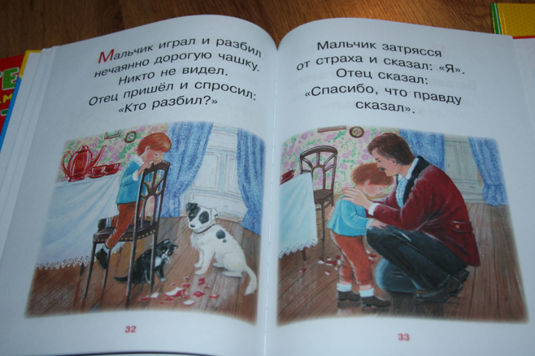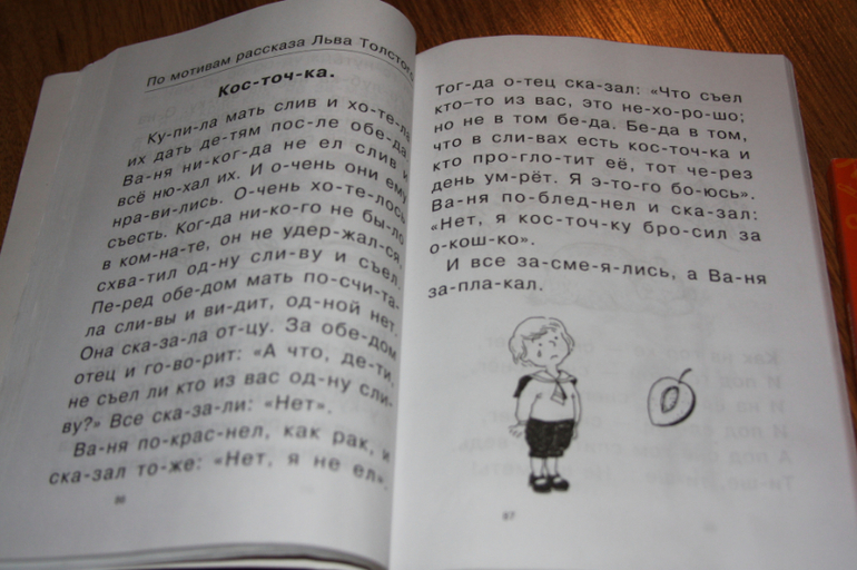 О грустном. Кто-то когда-то нам отдал стопочку, лежала и ждала "первого чтения" и выяснилось, что нам на первое чтение оно не подходит( Веселые истории в основном из школьной (не особо понятной трехлетке) жизни. Ну и иллюстрации так себе в верхних. А в нижних разбивка на слоги в виде дуг под словами. Ребенка отвлекает(