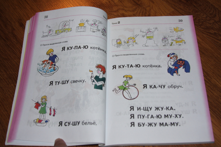 Все идеально - слова разбитые на слоги читаются для разогрева, а предложения напечатаны нормально, без отвлекающей разбивки. За урок проходили разворот, читали страницу в классе, страницу дома или весь разворот в классе, а дома перечитывали до беглости.