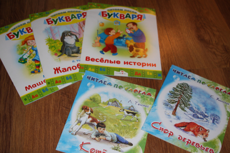 Наша любовь: книжки для первого чтения с большими буквами, понятными историями, ясными (хоть и компьютерными) иллюстрациями.
