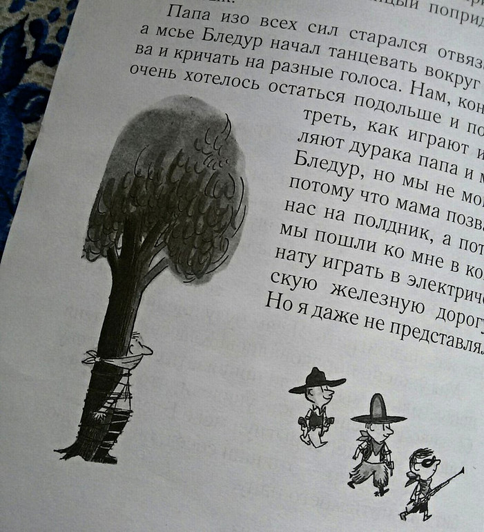 Папа изо всех сил старался отвязаться, а мсье Бледур начал танцевать вокруг дерева и кричать на разные голоса. Нам, конечно, очень хотелось остаться подольше и посмотреть, как играют и валяют дурака папа и мсье Бледур, но мы не могли, потому что мама позвала нас на полдник, а потом мы пошли ко мне в комнату играть в электрическую железную дорогу. Но я даже не представлял себе, что папа так сильно любит играть в ковбоев. Когда вечером мы снова спустились в сад, мсье Бледур уже давно ушел, а папа все еще был привязан к дереву, кричал и строил рожи.