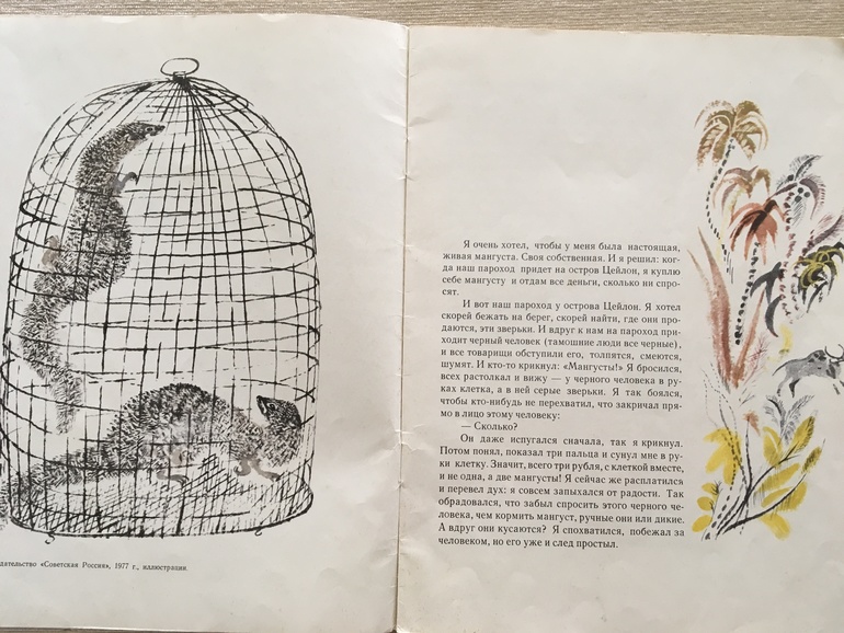 "Мангуста - тоже очень увлекательная книжка! Там рассказывается, как один мальчик, мечтавший купить мангусту, выторговал мангусту и поселил ее у себя в каюте. Даже не одну, а две: одна была ручная, а другая дикая. Однажды кто-то заметил в индийских брёвнах, которые везли на корабле, змею, и мальчик пустил своих мангуст туда, и они вытащили змею! А потом змею добили.