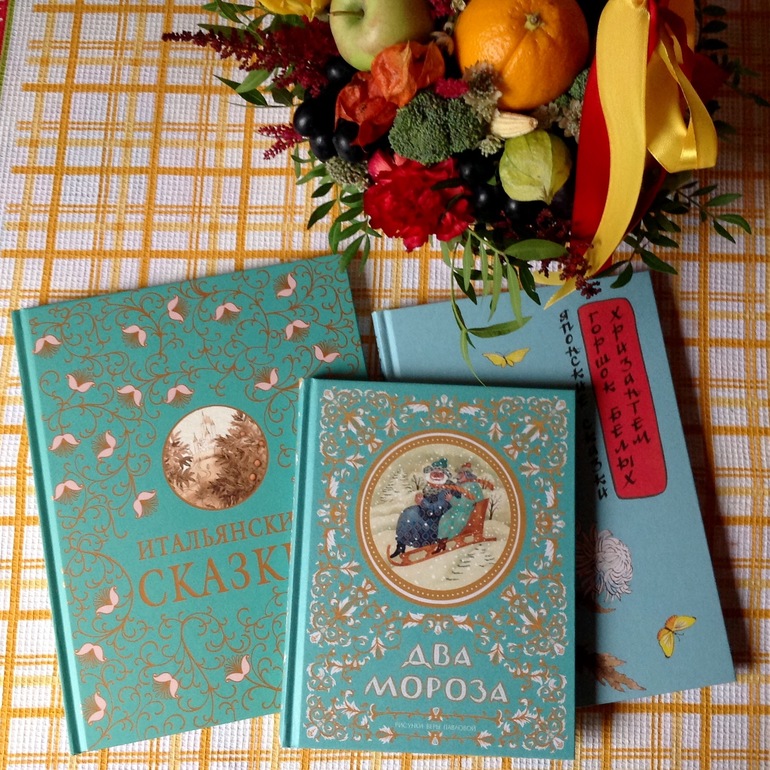 Итальянские и японские сказки. Тоже очень красивое оформление! Я правда, думала они будут одного формата как сказки от Речи, но нет, они совершенно разные. Японские сказки достаточно узкая, "бумажная" на ощупь обложка. Итальянские и "Два мороза" между собой похожи оформлением. Последняя меньше размером и обложка другого оттенка.