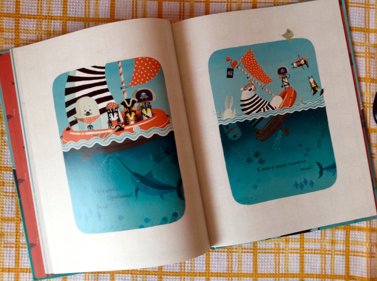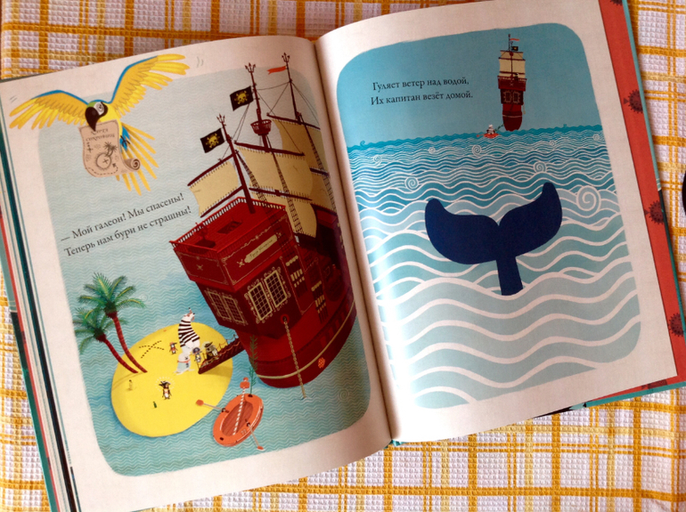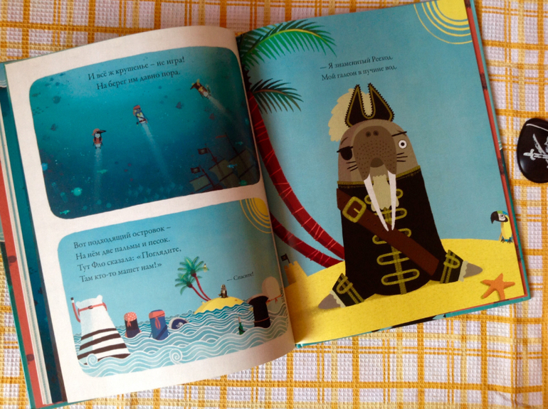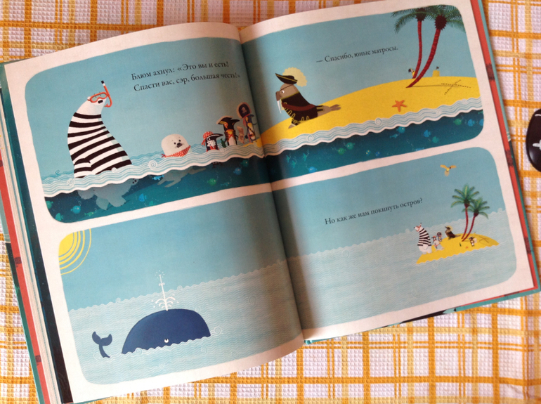 Пятеро друзей пиратов отправляются искать сокровища. Однако, вот незадача рыба-пила проткнула их пиратскую надувную лодку)) Но как говорится не было бы счастья ... на дне морском в пучине вод... им попадается... флаг, грот-мачта и корма"... затонувший пиратский галеон, а чуть позже они спасают главного пирата. Капитана затонувшего галеона. Тоже очень динамичная и интересная история, причём сюжет завязан на иллюстрациях. Книга меньше, чем Белки, страницы мелованные. У сына теперь присказка " отдать швартовы!йо-хо-хо!" ))) Пираты, кстати, ему нравятся больше, чем белки)) Здесь есть карта сокровищ, эмоциональная мимика героев, великолепный корабль, который в конце трансформируется из пиратского плав.средства в очень весёлый аттракцион для пингвинят. А между тем жадный попугай так и остался на острове, охранять сокровища.