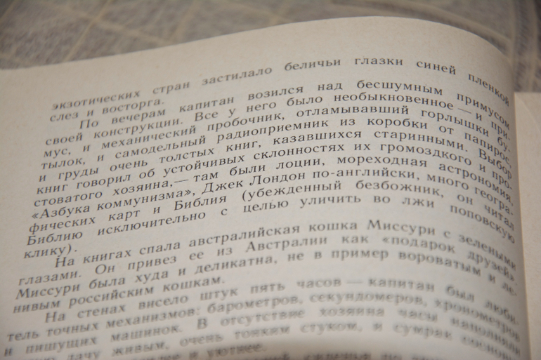 "По вечерам капитан возился над бесшумным примусом своей конструкции. Все у него было необыкновенное - и примус, и механический пробочник, отламывавший горлышки бутылок, и самодельный радиоприемник из коробки от папирос, и груды очень толстых книг, казавшихся старинными. Выбор книг говорил об устойчивых склонностях их громоздкого и простоватого хозяина, - там были лоции, мореходная астрономия, «Азбука коммунизма», Джек Лондон по-английски, много географических карт и Библия (убежденный безбожник, он читал Библию исключительно с целью уличить во лжи поповскую клику).