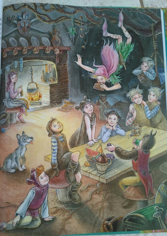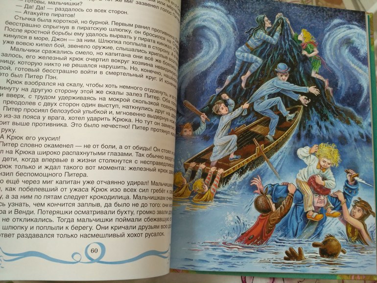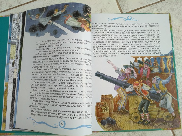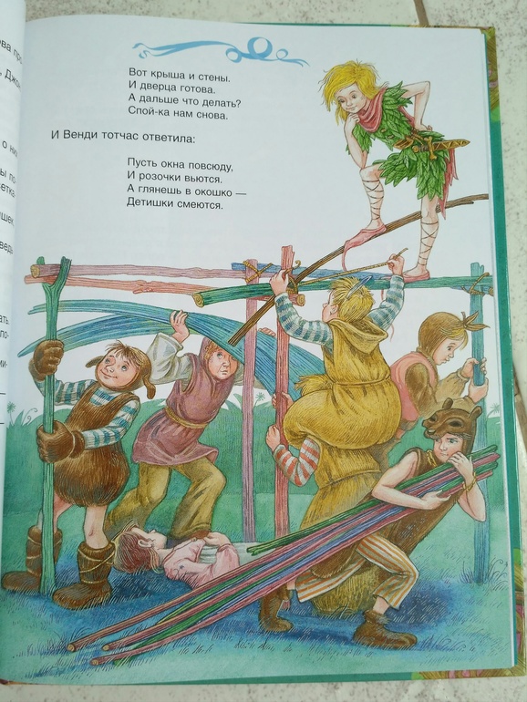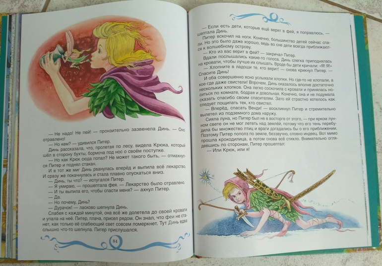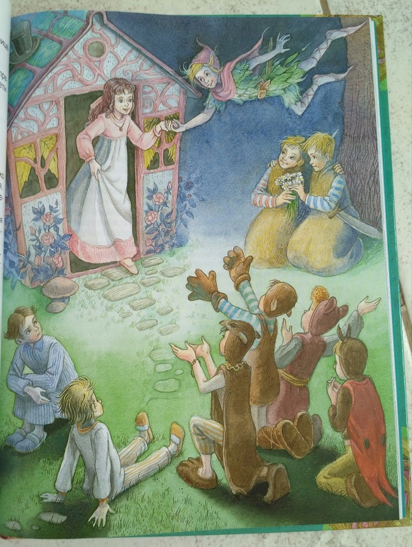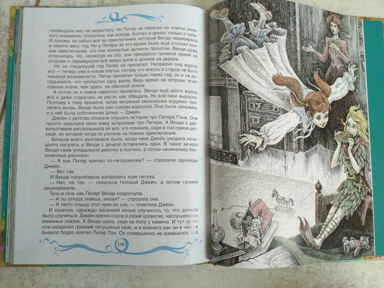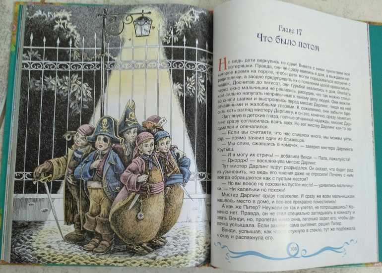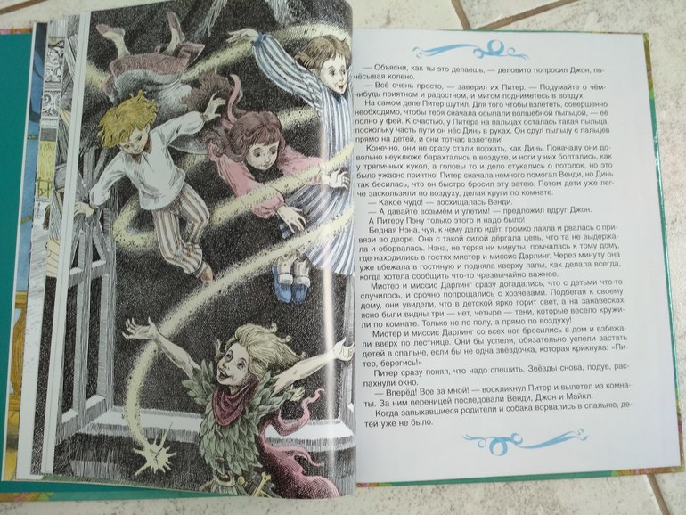 Мне понравилось что начало книги не затянуто, а буквально на двух страницах мы узнаем о семье Венди. Просто когда мы читали первый раз "Питера Пэна" в пересказе Ирины Токмаковой начало далось тяжело, первые три главы мы читали без интереса, так как слишком много ненужных подробностей было.